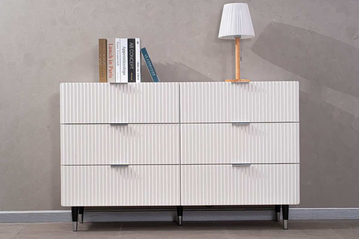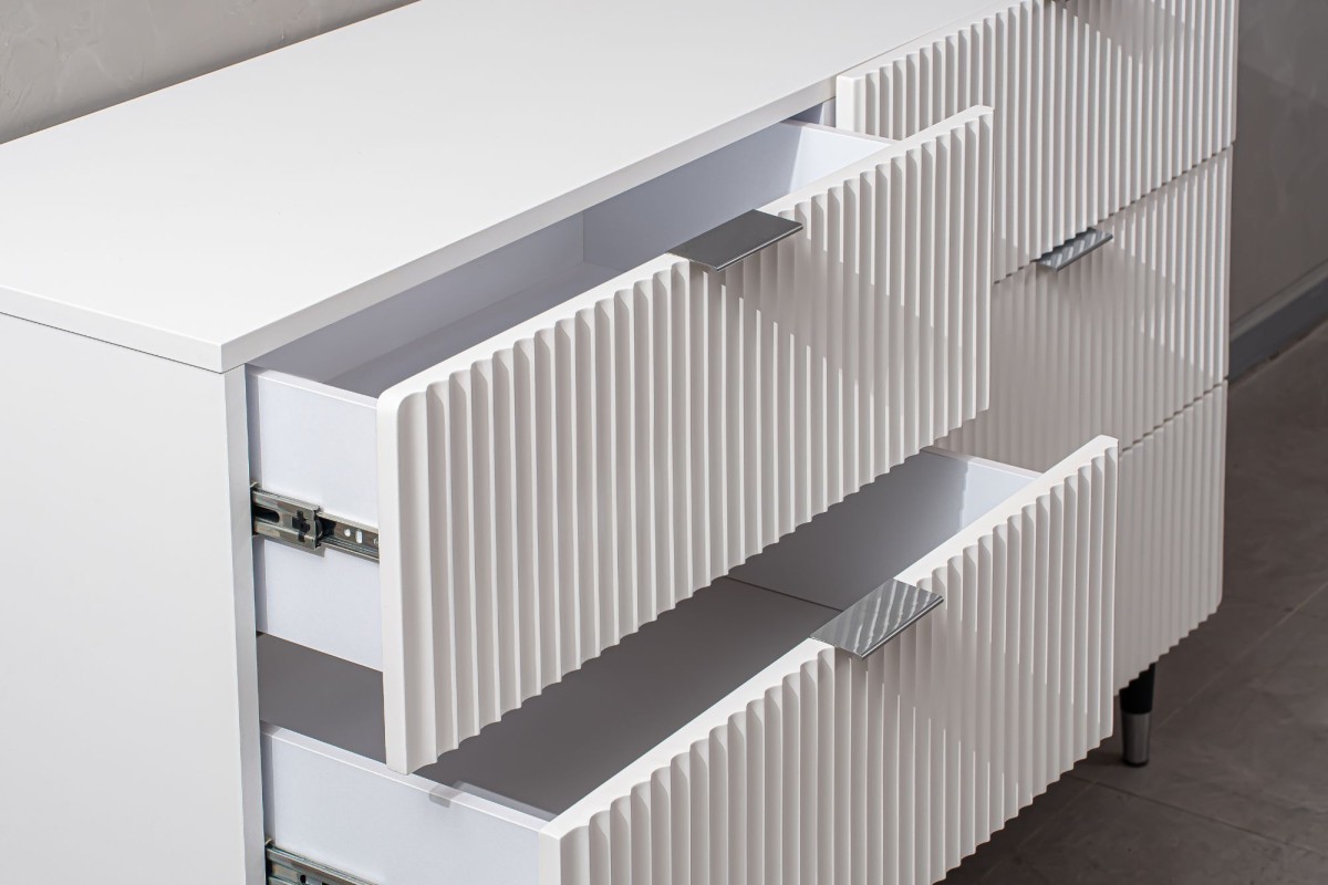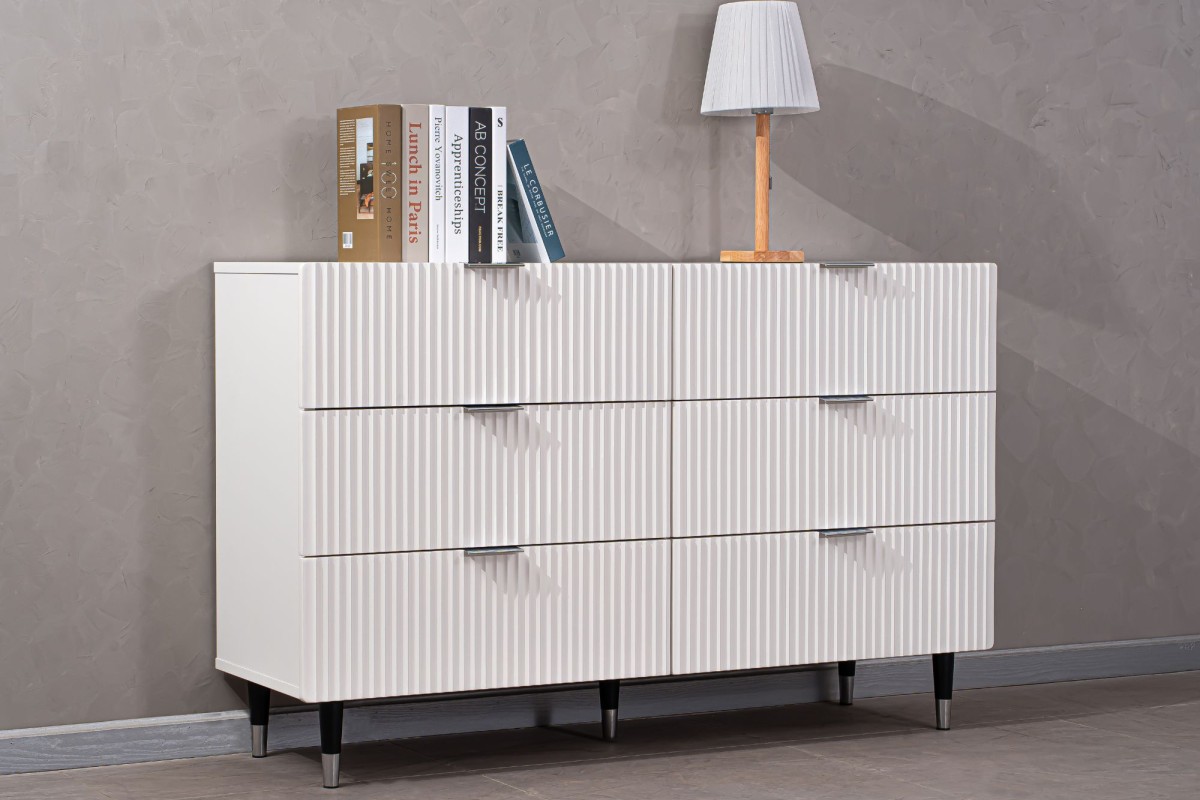 It's featured with fluted drawer front and metal handles and legs, the Wave dresser will be a stand out in your bedroom, while optimising your storage space.